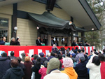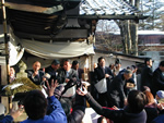 2月3日は節分。長倉神社、諏訪神社など町内の各所で福豆まきが行われ、境内は「福」を求める多くの参拝者でにぎわった。今年一年の福を願う厄除け祈願も行われ、諏訪神社では佐藤雅義軽井沢町長や佐藤泰春万平ホテル会長ら町内外の有力者が「福は内!」の大きなかけ声と共に福豆や福だるまを投げた。福豆の入った袋の中には熊手などと引き替えられる抽選券もあり、参拝者は競って福豆を拾いあっていた。 |