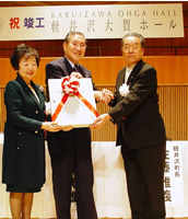 ソニー名誉会長の大賀典雄さんから町に寄贈される「軽井沢大賀ホール」が12月5日完成し、竣工・引渡し式がおこなわれた。式典には、大賀さんや妻の緑さんらが出席し、出来上がったばかりのステージ上で佐藤雅義町長にホールの鍵を手渡した。大賀さんは挨拶の中で「軽井沢は、戦中には妻が疎開先の諏訪から苦労してピアノのレッスンのために通った思い入れの強い町。これからこのホールが常に満席になるよう、町の皆さんで知恵を出し合って下さい」と話した。これを受けて佐藤町長は「景観にマッチした軽井沢初の音楽ホールが出来たことを町民と共に喜び感謝している」と述べ、大賀さんとホール内の椅子を寄贈した鹿島建設梅田社長へそれぞれ感謝状を贈った。
