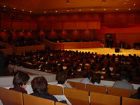式典後には、フィンランドのオーケストラ「シンフォニア・フィンランディア」、フルート奏者瀬尾和紀さん、ヴァイオリニスト奥村愛さんによる試聴コンサートが行われ、招待客や公募に当選した観客800名がホールに響くプロの音色を楽しんだ。音響効果を考え対面のない五角形にしたこの音楽ホールに、大賀さんは「思っていた通り不協和音がなく素直な音」と笑顔で語った。東京フィル石丸恭一楽団長も「無駄な反射音が一切なくかつ生の音でもない。オーケストラでもうまく音が抜けてやかましくない。世界でも有数の素晴らしいホールでは」と絶賛した。 |