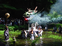 日本一長いと言われている全長45メートルの龍が7月29日、今年も御代田町に舞った。まつりのオープニングを飾る開眼式が執り行われた真楽寺では、大沼池の上をゆっくりと這うように舞う龍や、三重の塔の下で銅鑼や太鼓の音に合わせ、所狭しと暴れ舞う龍の姿が見られた。途中豪雨に見舞われ、一時舞が中断するというハプニングもあったが、集まった見物客は大迫力の龍の姿に満足そうな表情を浮かべていた。 ●龍神まつり実行委員会事務局 御代田町役場商工観光係:TEL0267-32-3111