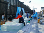 軽井沢氷彫刻国際展2004 団体戦競技開始 「軽井沢氷彫刻国際展2004」の団体戦競技が始まった。会場となる軽井沢駅前通りではイベントのメインステージとなる氷のステージ「アイスステージ」や滑り台を軽井沢高校の生徒や軽井沢ウィンターフェスティバルの実行委員らが製作。団体戦競技にはスウェーデンやベルギーなど海外から参加の8チームを含む30チームが参加し、電動ノコギリなどの電動工具やノミを使って氷の彫刻作品を製作を開始した。30日(金)の早朝まで競技は続き、10時30分には会場開きとなる。作品の展示は2月1日(日)までで、この間は連日22時までライトアップされる。 |