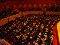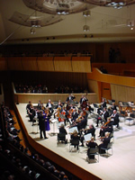 式典後には、フィンランドのオーケストラ「シンフォニア・フィンランディア」、フルート奏者瀬尾和紀さん、ヴァイオリニスト奥村愛さんによる試聴コンサートが行われ、招待客や公募に当選した観客800名がホールに響くプロの音色を楽しんだ。音響効果を考え対面のない五角形にしたこの音楽ホールに、大賀さんは「思っていた通り不協和音がなく素直な音」と笑顔で語った。東京フィル石丸恭一楽団長も「無駄な反射音が一切なくかつ生の音でもない。オーケストラでもうまく音が抜けてやかましくない。世界でも有数の素晴らしいホールでは」と絶賛した。 |