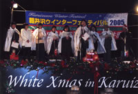 11/27(土)、矢ケ崎公園で「ホワイトクリスマスin軽井沢」のシンボリックツリーの点灯式が行われた。軽井沢中学校吹奏楽部の演奏、「手のひらの会」の手話による唄、キャロリングの後、カウントダウンと共に澄みきった夜空に花火が打ちあがり、シンボリックツリー、矢ケ崎橋などのイルミネーションがいっせいに点灯された。まわりでは大きな歓声が上がり、寒さを忘れて記念撮影をする人達でにぎわった。