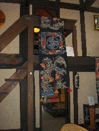 糊で描き、藍色や淡い青に染めた図柄は、伝統的なものから日常的なものまで図柄は多種多様。お祝いの時だけ使えたという紅色の作品も多く展示されている。外国人にも人気が高く、今はなかなか手に入らない藍木綿の座布団や布団、鞍掛、暖簾など約70点を展示。江戸末期の建物、三五荘の室内によくマッチして美しい空間を作り出している。